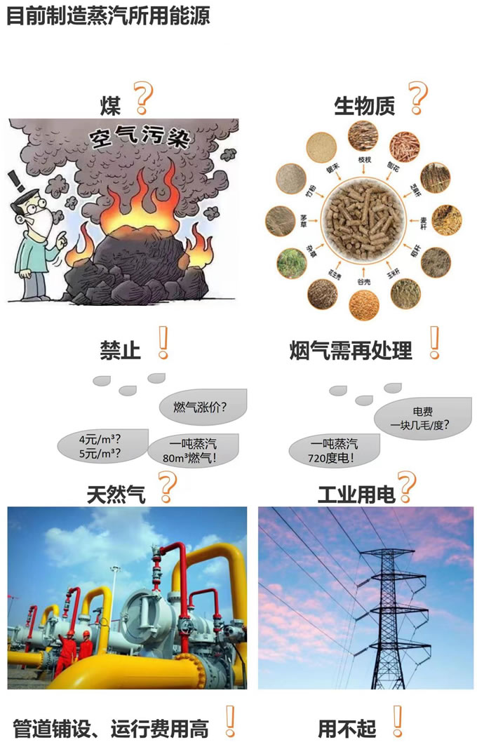 煤已经禁止,生物质很多地方不给烧,主流的就是用天然气来制造蒸汽,直接用电制造蒸汽的比较少,因为电费用不起(低价电地区除外), 也有部分企业用电厂管道蒸汽,但是也会有各种限制。