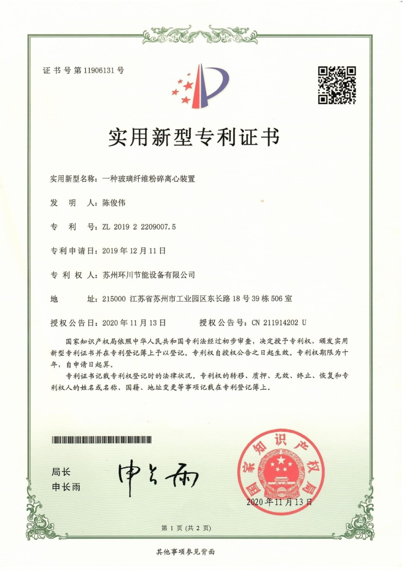 一种玻璃纤维粉碎离心装置专利证书