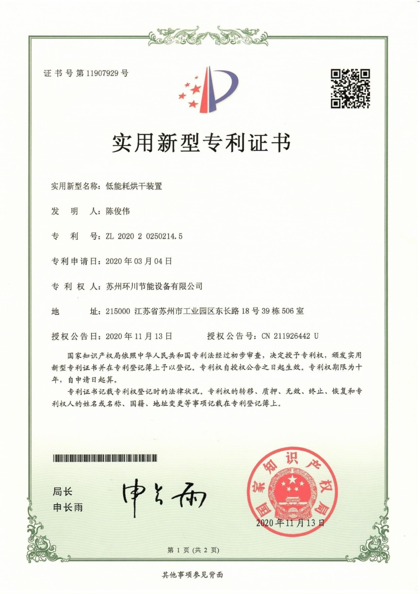 低能耗烘干装置专利证书