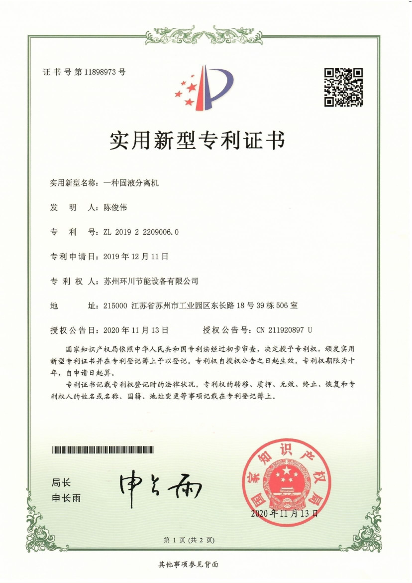 一种固液分离机专利证书